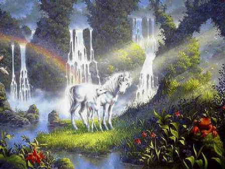To continue on into the valley, click on the unicorns. If you wish to return to the garden and explore some more, click on the path.